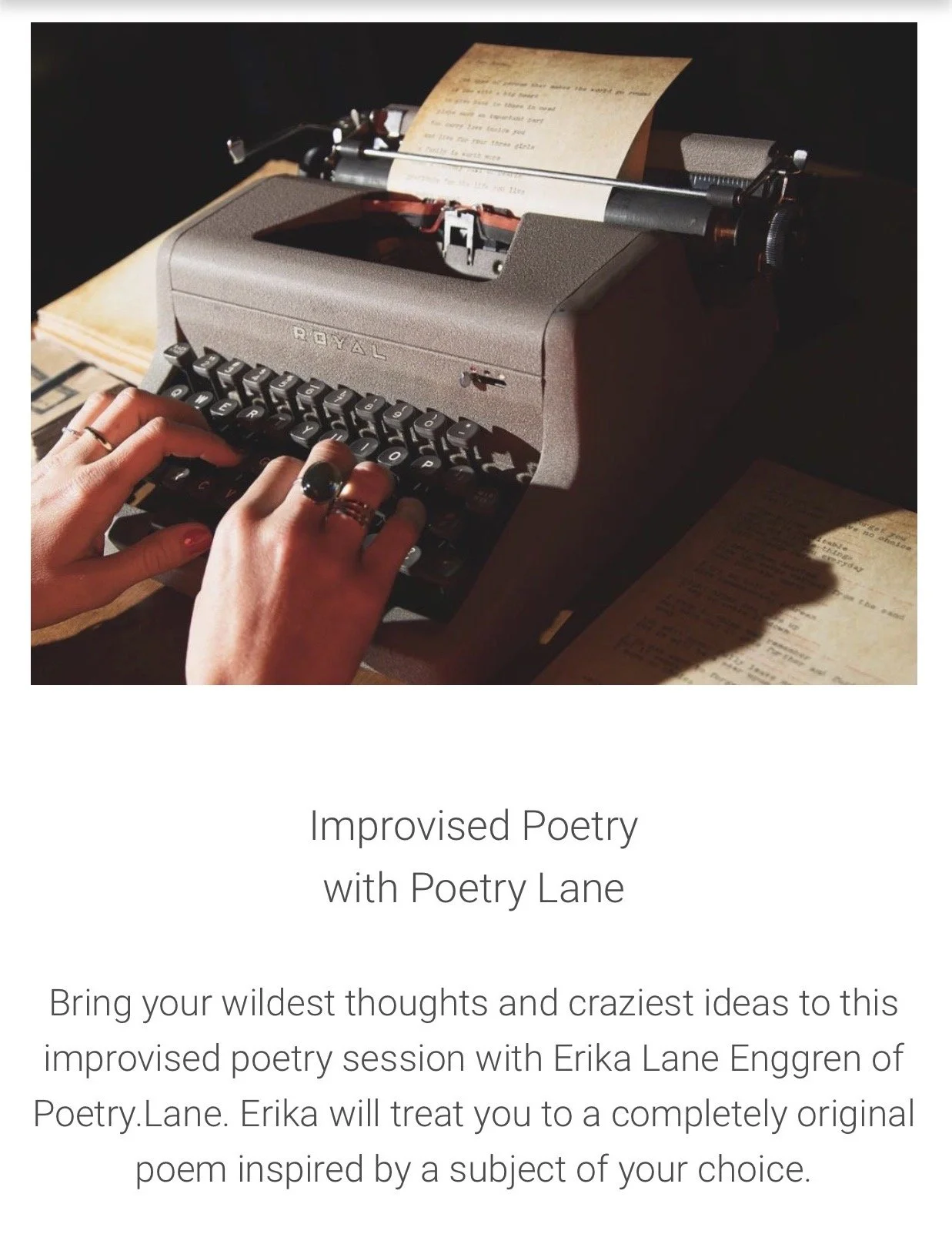Poetry on the spot for any event looking to add a personalized touch. It is an energy exchange that leaves people feeling seen and special. Feel the magic through each line, a unique experience beyond the norm.